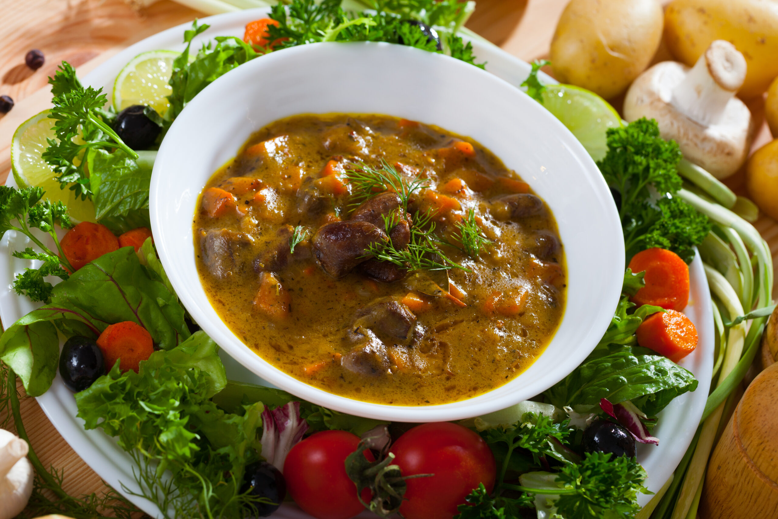 Opłukane i oczyszczone serca pokrój i podsmaż z cebulą. Prawdziwki zalej wrzątkiem i odstaw na 15 min. Namoczone grzyby wlej razem z wodą, w której się moczyły do serc drobiowych i duś dodając liści laurowych i orzechów. Dolej białe wino. Dodaj sól i pieprz do smaku. Kiedy orzechy zaczną mięknąć, dodaj rozgniecionego czosnku. Powoli też rozprowadź przesmażoną mąkę tak, aby nie powstały grudki i duś na małym ogniu do zgęstnienia. Dodaj posiekaną zieleninę. Podawaj z grzankami lub kawałkami chleba.