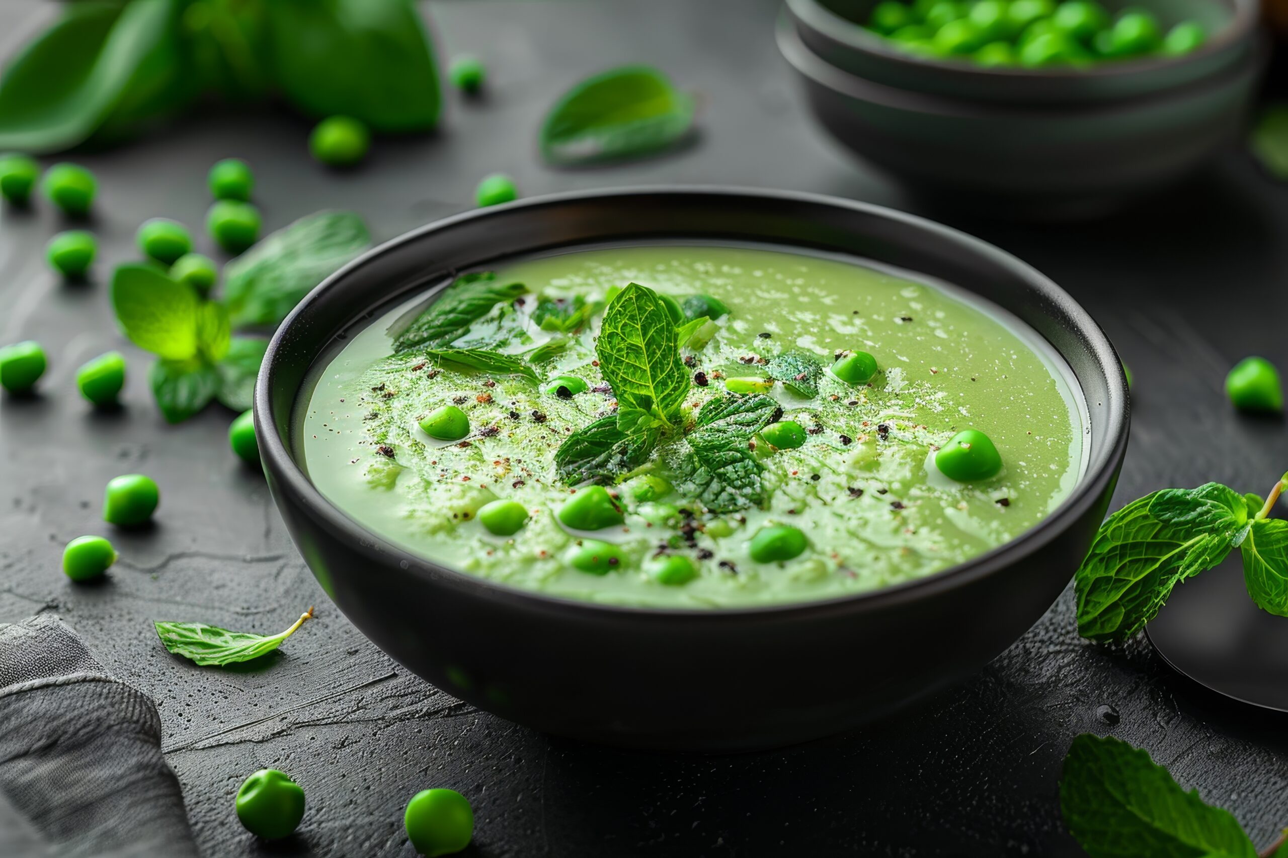 Roztop masło w garnku, uważając by się nie przypaliło. Rozmieszaj dokładnie z mąką, a następnie stopniowo dolewaj dwie szklanki chłodnej wody lub lekkiego warzywnego bulionu, stale i energicznie mieszając np. trzepaczką, by nie powstały grudki. Następnie dodaj groszek i zagotuj. Dodaj posiekaną miętę i gotuj jeszcze przez 2 min., by mięta uwolniła aromat. Zupę dokładnie zmiksuj, dopraw do smaku solą i pieprzem, a na koniec dodaj jogurt. Zupę podawaj ciepłą, ale nie gorącą – tak smakuje najbardziej. Udekoruj listkami bazylii.